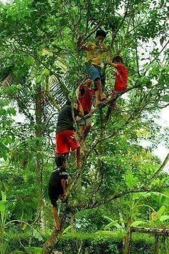 A group of children playing swimming in kali near the townhouse.